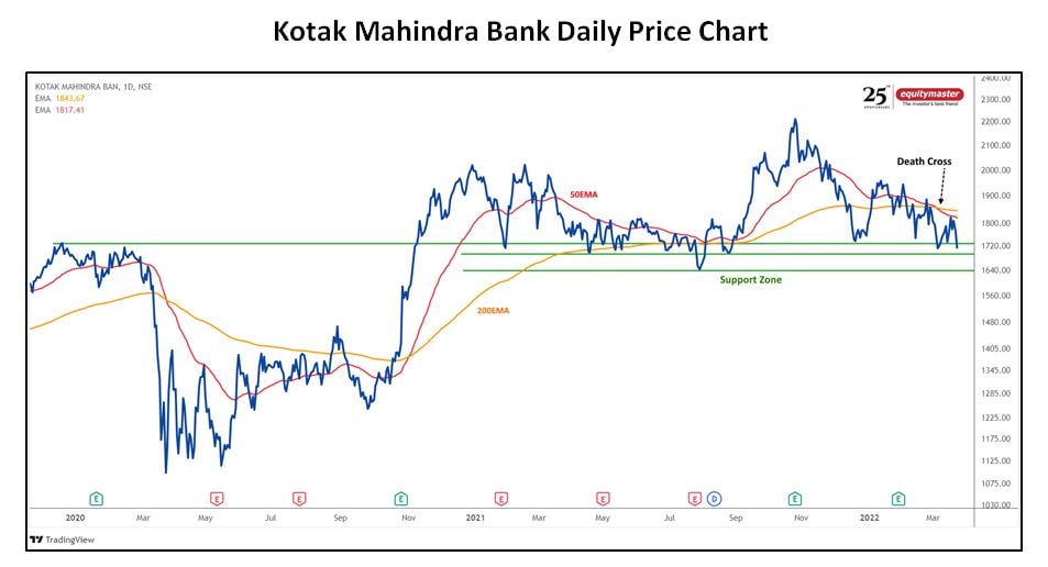 Technically, the death cross is visible on chart at Rs 1,850 signalling an end of bullish trend in the stock. The death cross happens when the short-term moving average (50-days) crosses below the long-term moving average.