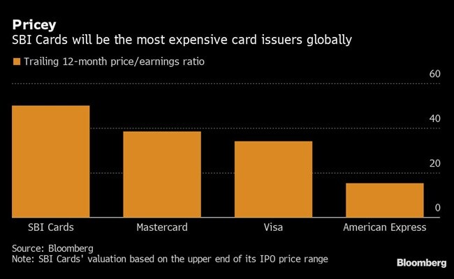 SBI Cards began taking orders on Monday, the day the country's stocks fell for the seventh day amid the virus scare. At the upper end of the price band of Rs 755 apiece, the offering will fetch Rs 103 billion ($1.4 billion) and value the issuer at over 49 times its trailing 12-month earnings -- the costliest among global peers including Visa Inc. and American Express Company.