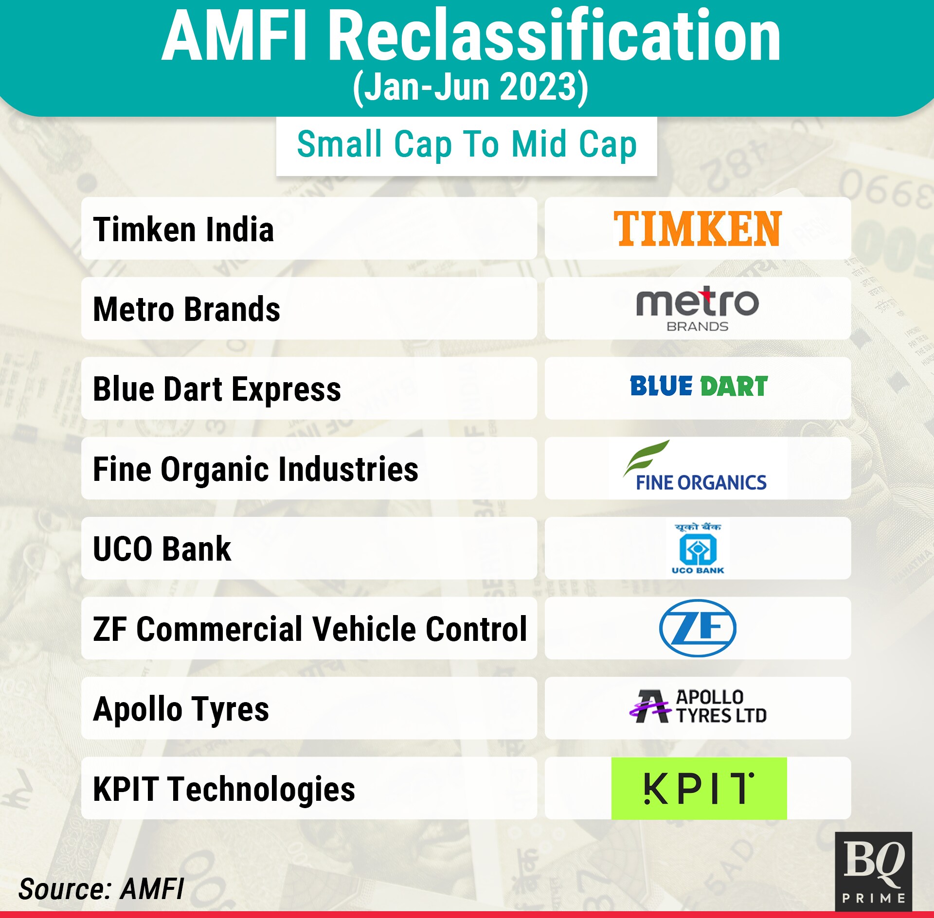 Stocks that move from the small- to mid-cap category include Timken India Ltd., Metro Brands Ltd., Blue Dart Express Ltd., Fine Organic Industries Ltd., UCO Bank Ltd., ZF Commercial Vehicle Control Systems Ltd., Apollo Tyres Ltd. and KPIT Technologies Ltd.