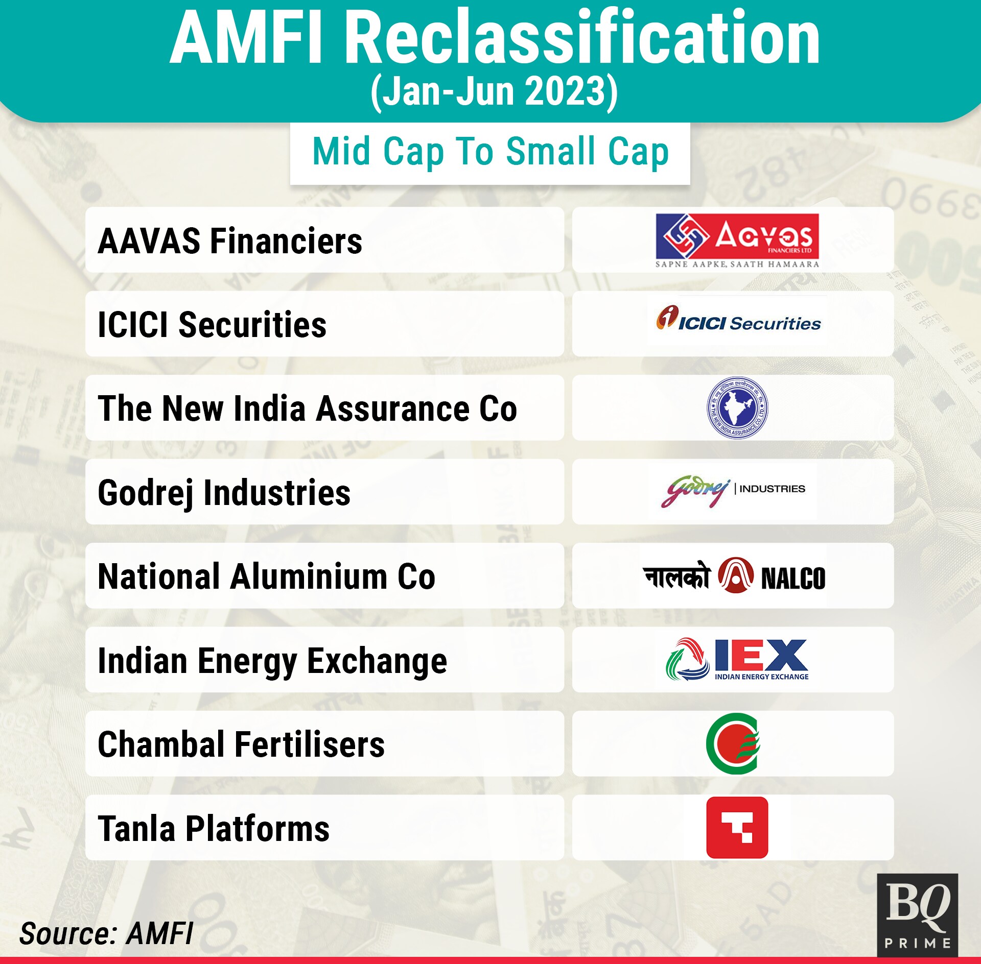 Moving from the mid-cap to small-cap category are AAVAS Financiers Ltd., ICICI Securities Ltd., The New India Assurance Co., Godrej Industries Ltd., National Aluminium Co., Indian Energy Exchange Ltd., Chambal Fertilisers & Chemicals Ltd. and Tanla Platforms Ltd.