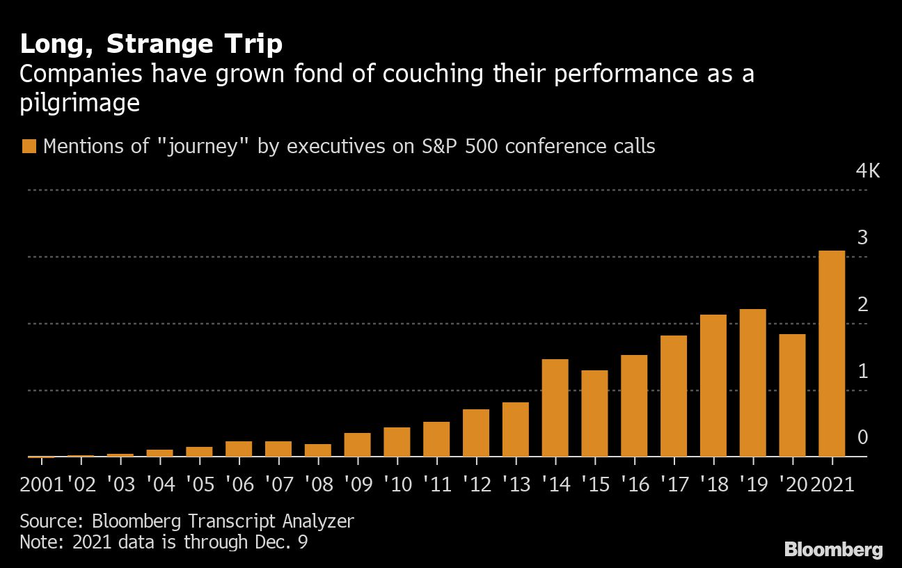 Mentions of the word “journey” by S&P 500 executives on conference calls this year have soared almost 70% to 3,091, making it one of the fastest-growing corporate buzzwords in recent memory. The term was rarely used before -- in fact, just once in 2001 -- but it's now used to describe practically any kind of business goal, even if it's totally mundane.