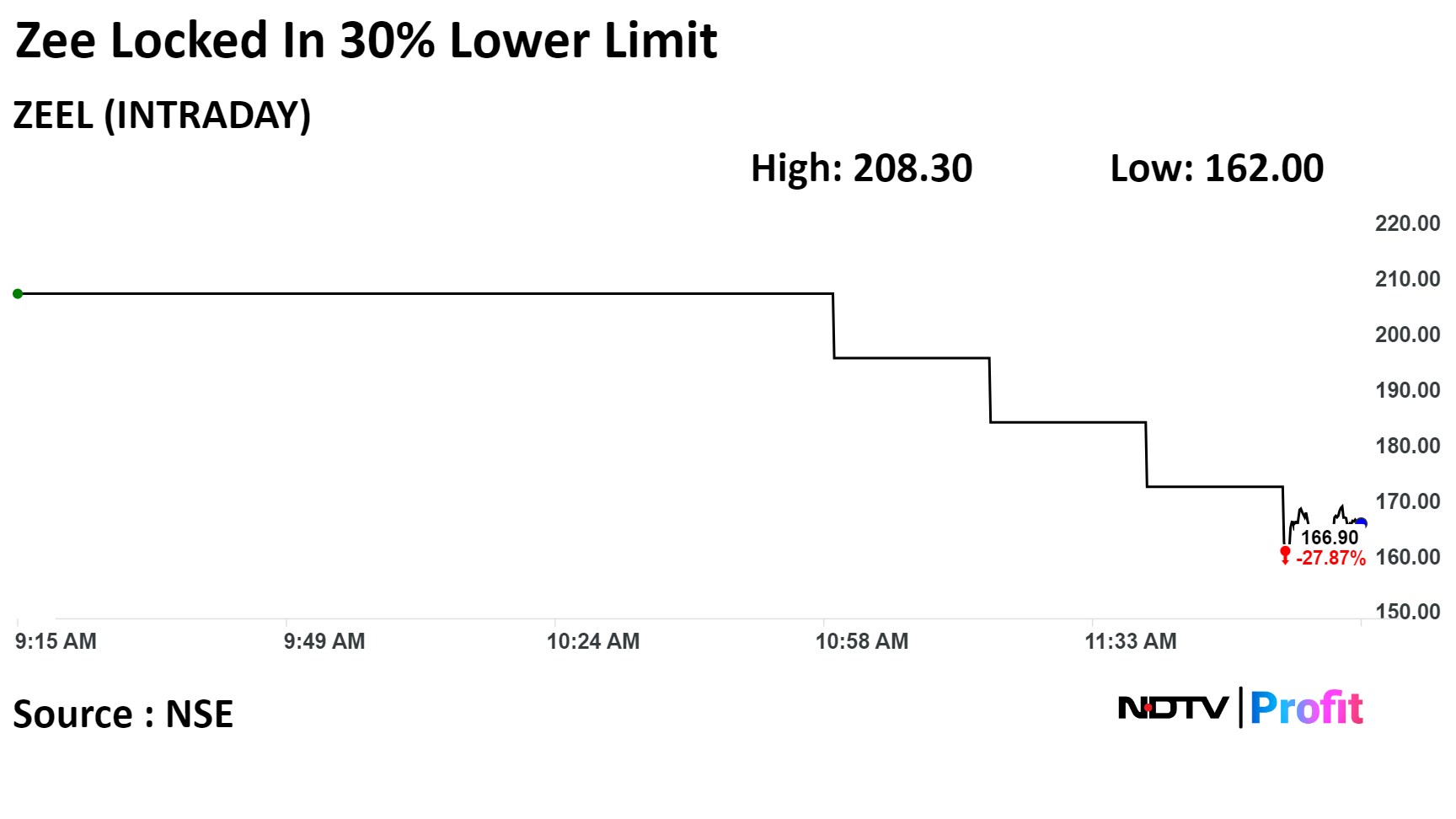Shares of Zee Entertainment Enterprises Ltd. were locked in a revised lower circuit of 30%, falling to their lowest in over three years, on Tuesday as brokerages downgraded the stock after Sony Group Corp.'s Indian unit terminated the merger agreement.