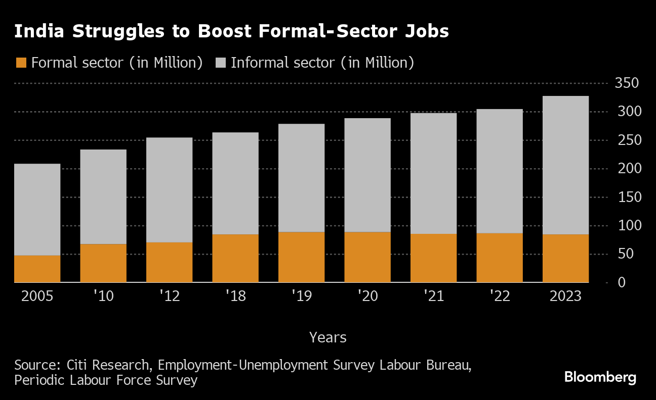 Also, fewer people are employed in the formal sector now than before Covid — the share was 25.7% in 2023, the lowest level in at least 18 years, Citi said. Only 21% of the workforce — or about 122 million people — in India have jobs that pay a salary or wages, compared with 24% before the pandemic. More than half of the 582 million workers in India are self-employed, the figures show.