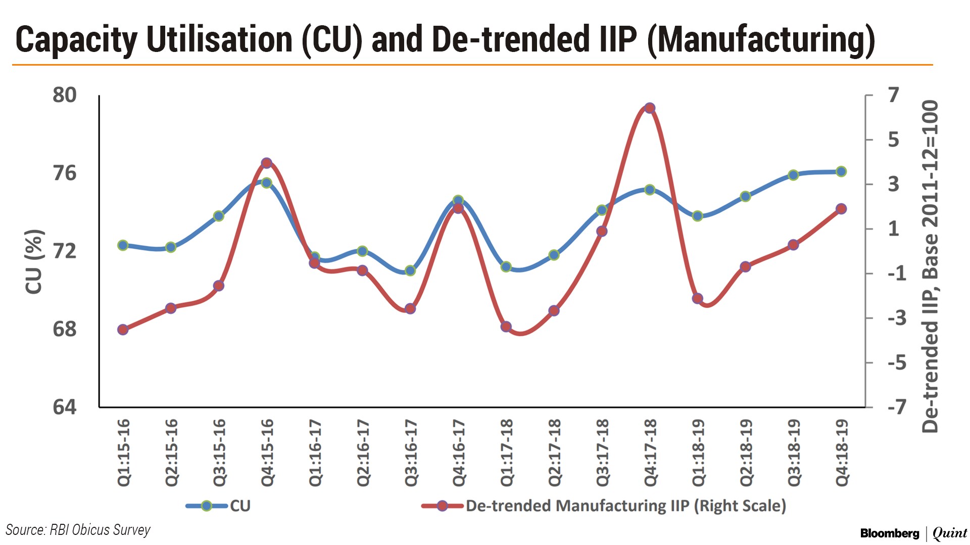 The āOrder Books, Inventories and Capacity Utilisation Survey' found that capacity utilisation rose by 0.2 percentage points to 76.1 percent in the fourth quarter of FY19. However, seasonally adjusted capacity utilisation declined by 1.1 percentage points to 74.5 percent, the survey showed.