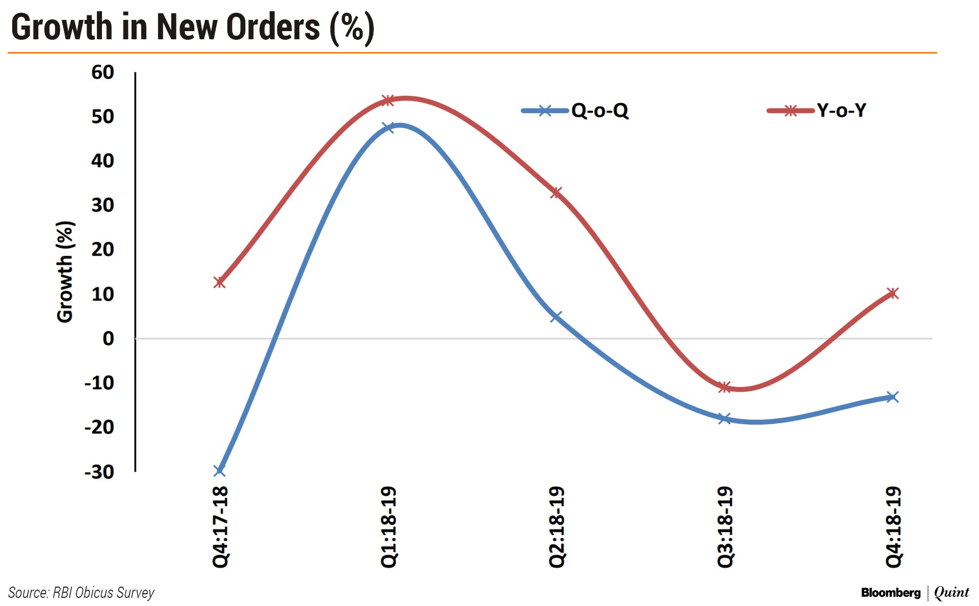 The pace of new orders declined compared to a quarter ago, the RBI said. However, order books increased on a year-on-year basis due to a favourable base effect.