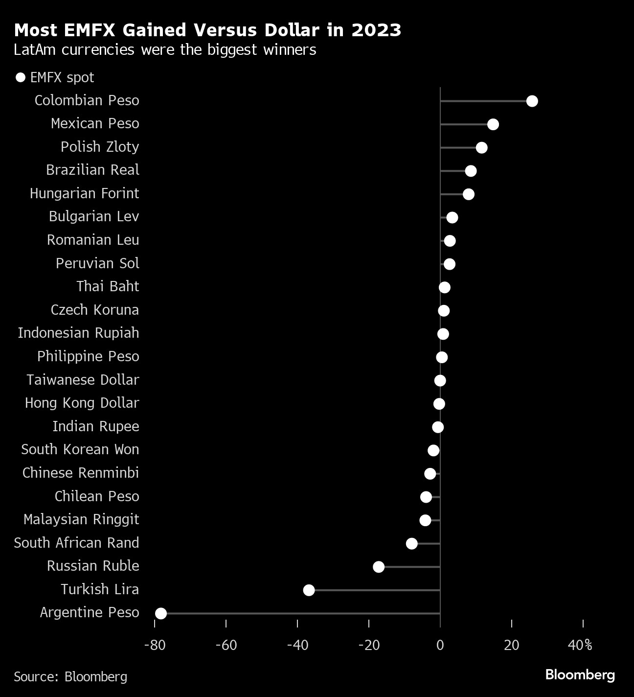 (Bloomberg) -- Emerging-market currencies closed out their best year since 2017 after soaring in the final quarter as the outlook for lower interest rates in the US revived investor appetite for risk.