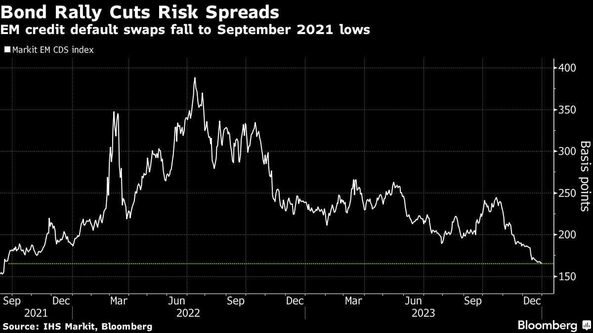 The cost of insuring exposure to emerging markets has also eased, with credit default swaps across 22 sovereign issuers sliding an average 72 basis points to levels last seen in September 2021.
