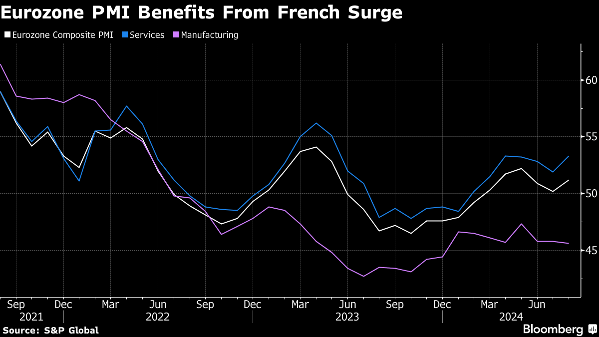 S&P Global's composite Purchasing Managers' Index jumped to 51.2 in August from 50.2 in July, exceeding even the most optimistic forecast in a Bloomberg survey of analysts. A gauge for services climbed to the highest level since April, though the region's manufacturing slump deepened.