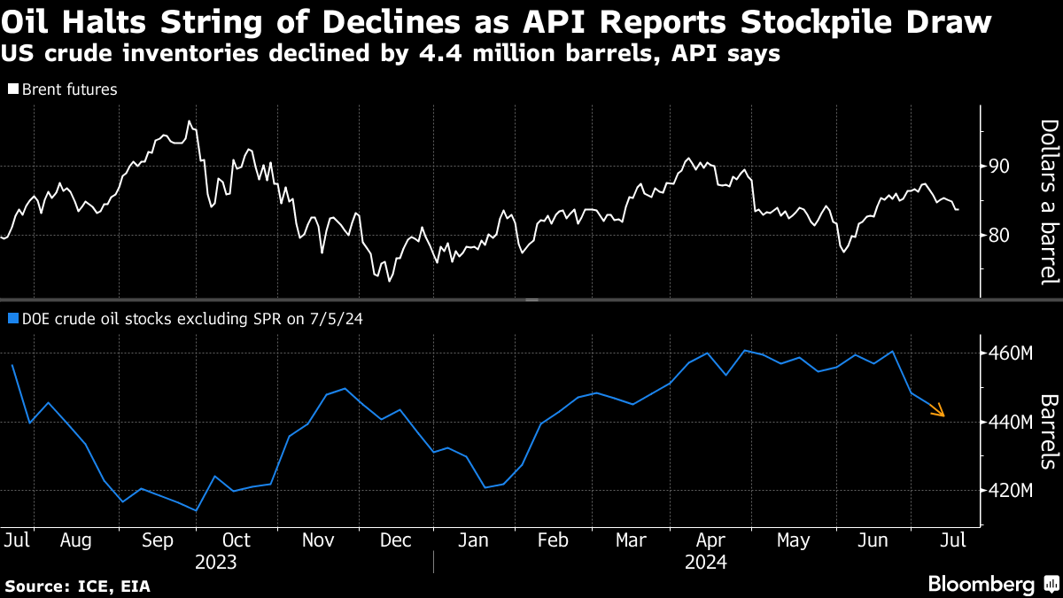 Brent traded below $84 a barrel while West Texas Intermediate was near $81. US crude stockpiles shrank by 4.4 million barrels last week, the American Petroleum Institute reported, according to people familiar with the figures. Official inventory data comes later Wednesday, and if confirmed, that would be a third straight drop, the longest run of draws since last September.