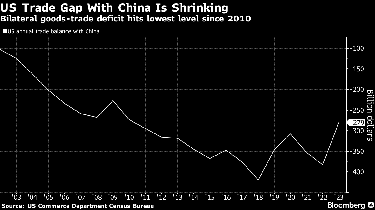 (Bloomberg) -- The US goods-trade deficit with China shrank to the smallest total since 2010 last year, reflecting a decline in imports from its geostrategic rival that will be welcomed in Washington.