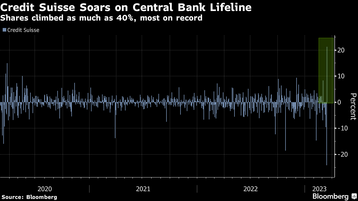 (Bloomberg) -- Credit Suisse Group AG shares surged as much as 40% after Switzerland's central bank stepped in to support the lender, triggering a rally in bank stocks across Europe on easing investor concern about a looming global banking crisis.