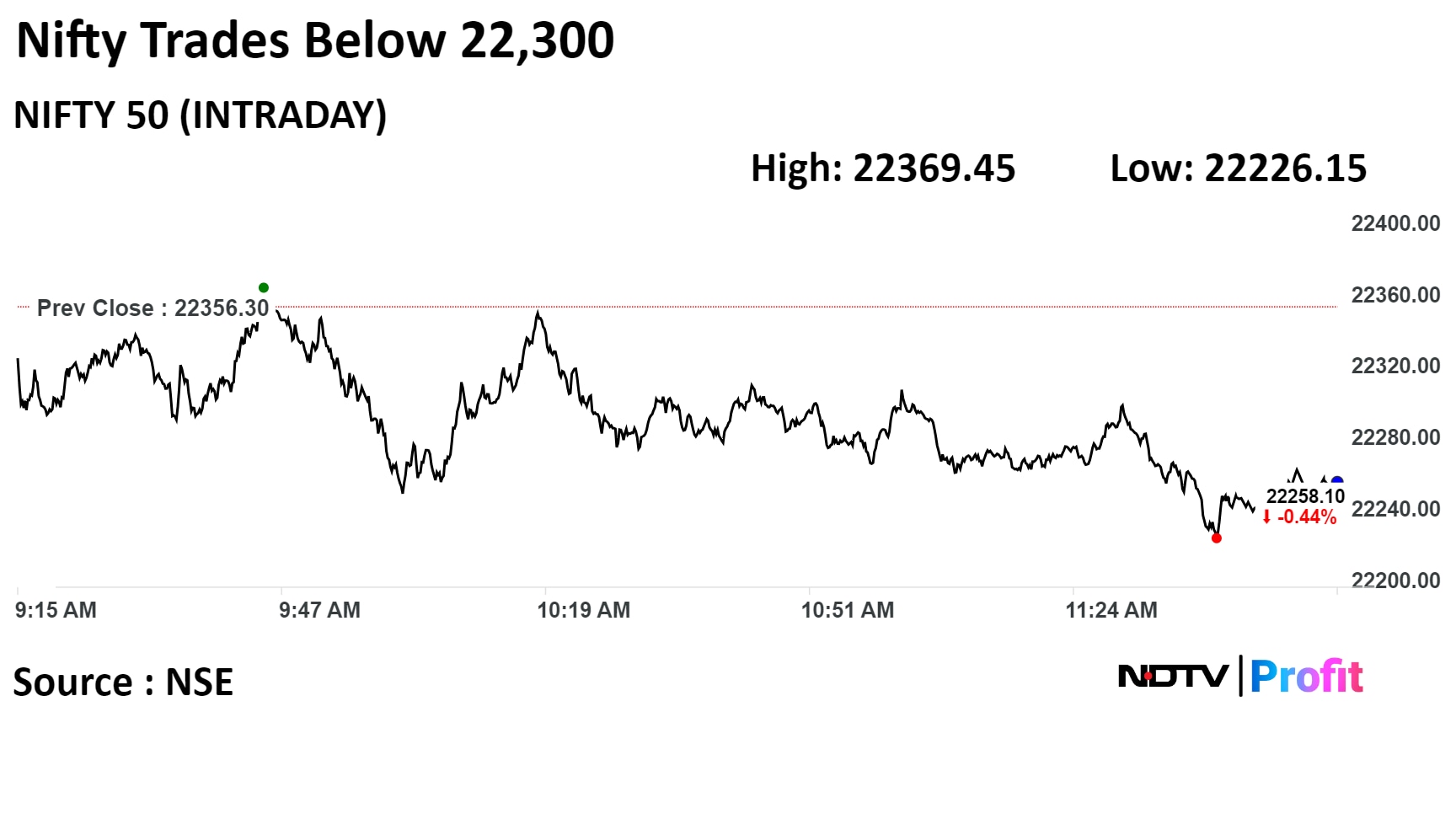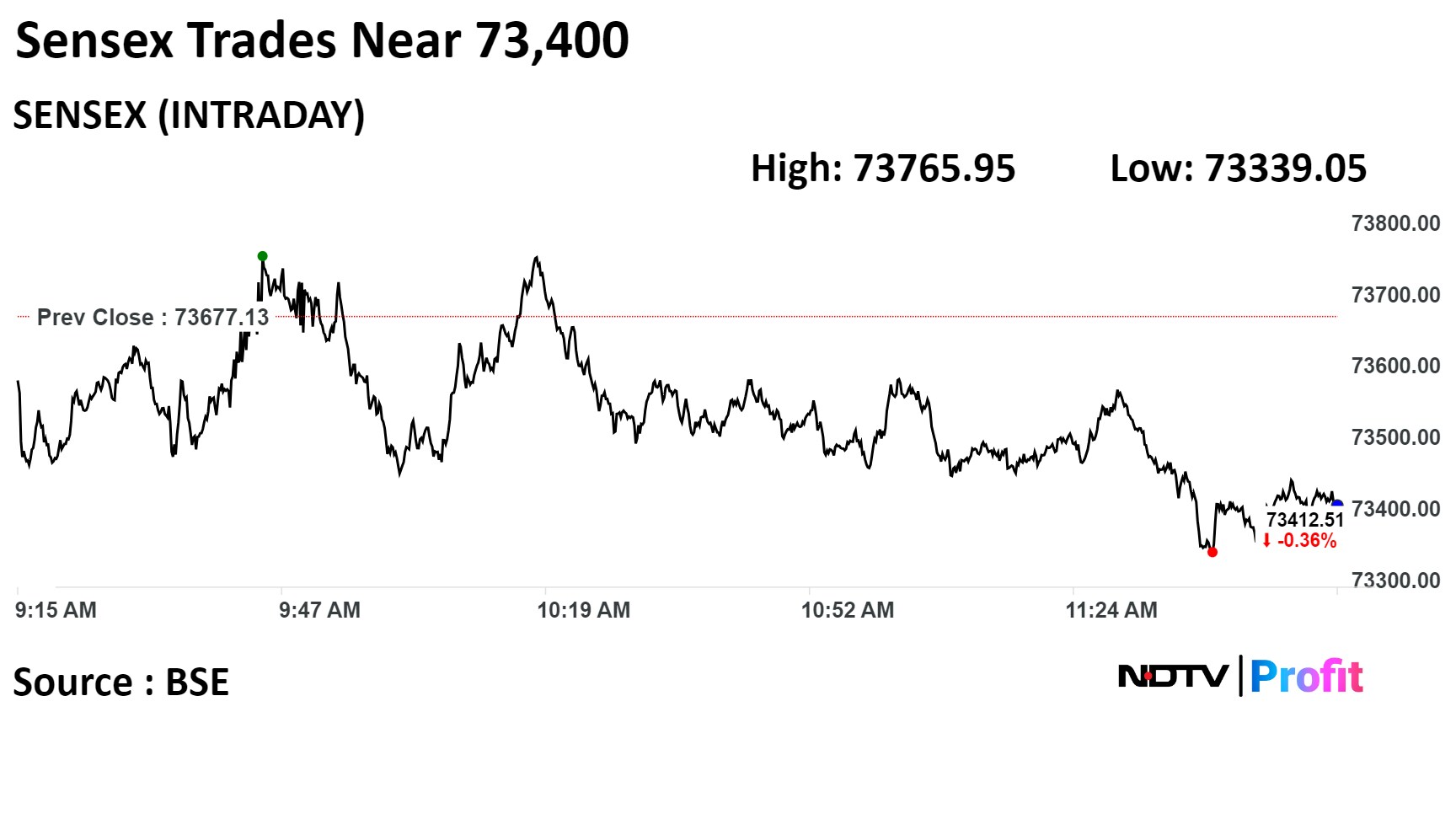 As of 11:59 a.m., the NSE Nifty 50 was trading 108.05 points, or 0.48%, lower at 22,248.25 and the S&P BSE Sensex was down 286.67 points, or 0.39%, at 73,390.46.