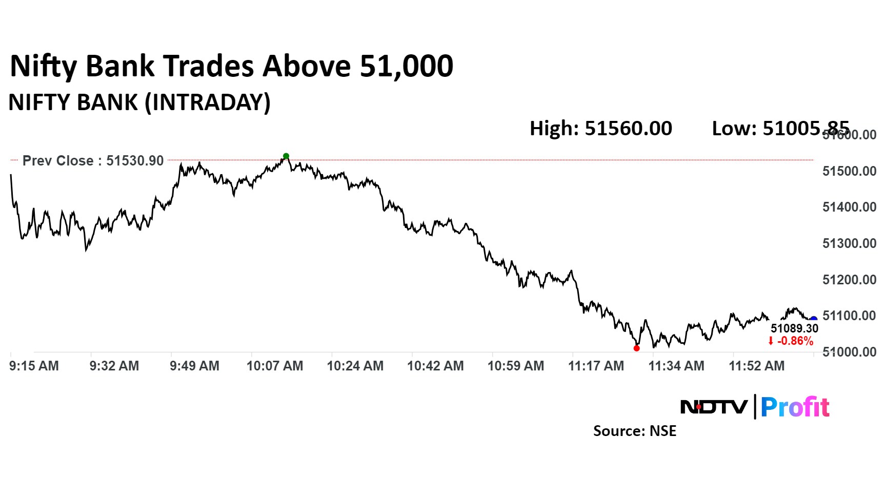 India's benchmark equity indices were trading near their day's low by midday on Friday, weighed by a fall in Tata Consultancy Service Ltd. and banking stocks. The 25,000 mark will be the inflection point for Nifty in the short term, an analyst warned.