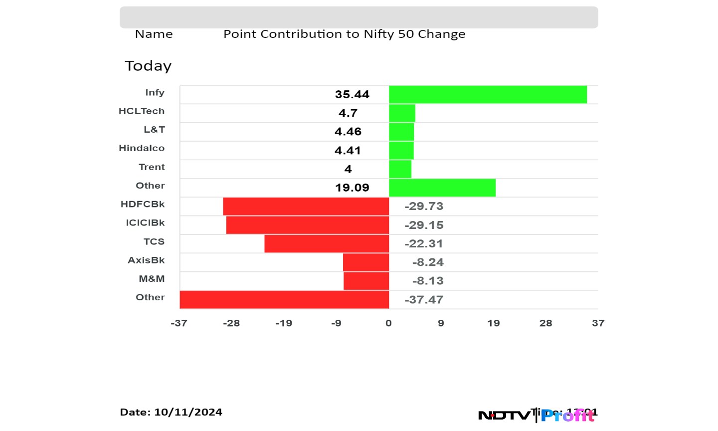 Shares of HDFC Bank Ltd., ICICI Bank Ltd., Tata Consultancy Services Ltd., Axis Bank Ltd., and Mahindra & Mahindra Ltd. pulled the Nifty lower. While those of Infosys Ltd., Tech Mahindra Ltd., Larsen & Toubro Ltd., Hindalco Industries Ltd., and Trent Ltd cushioned the fall.