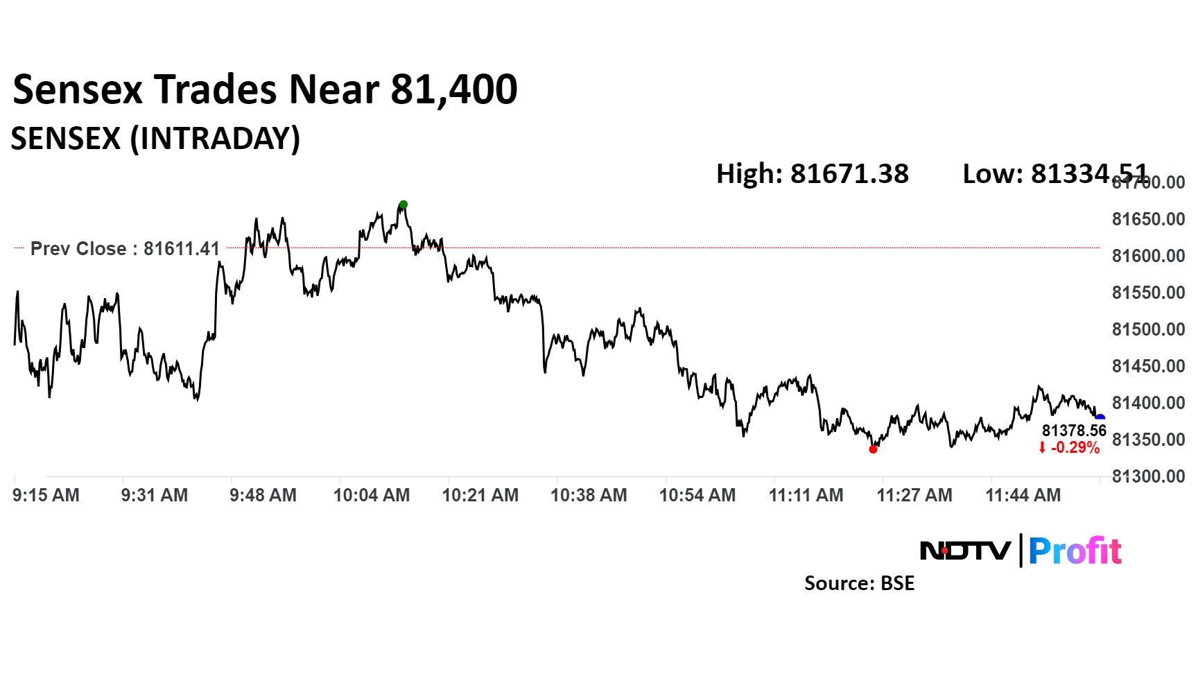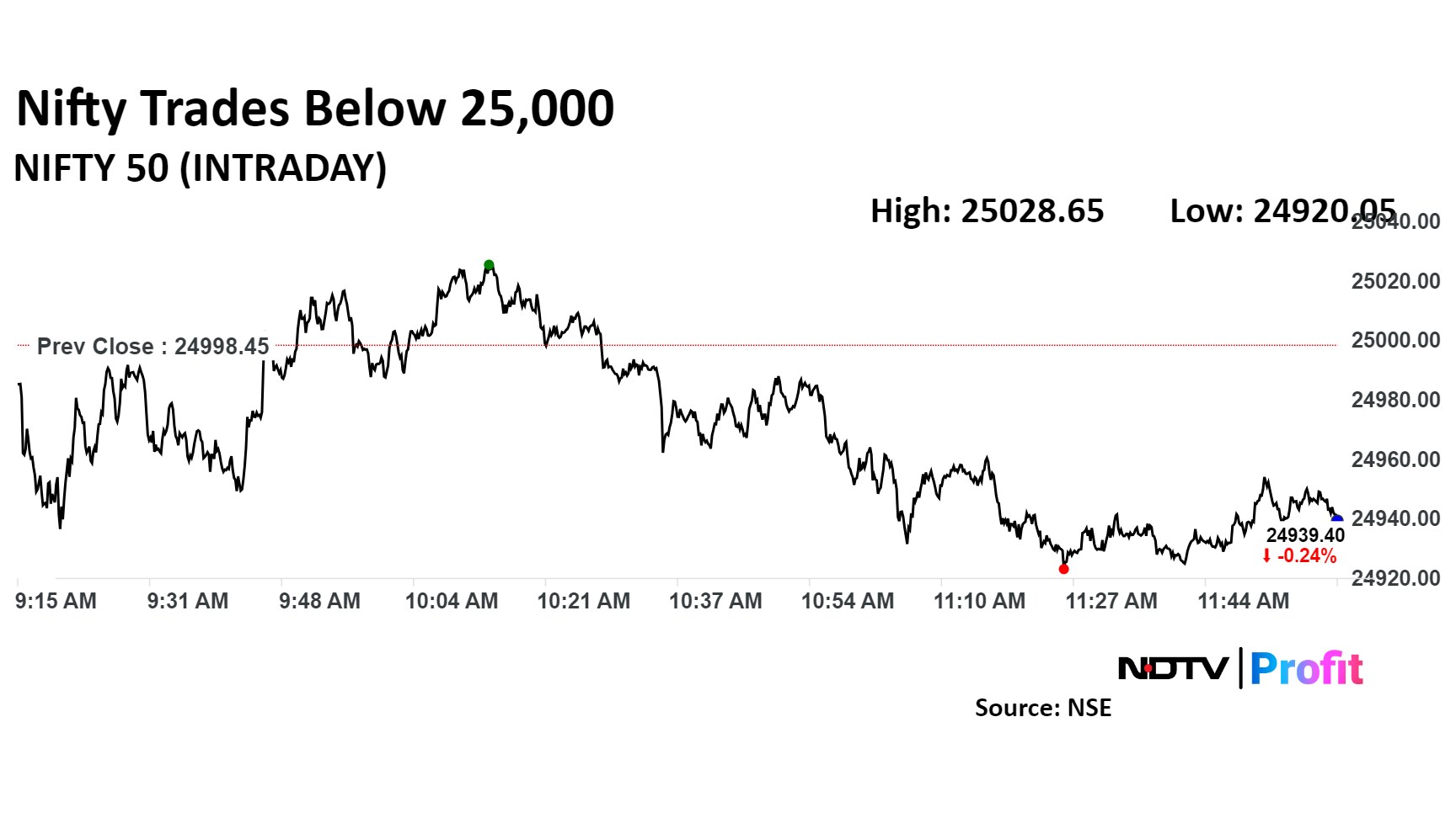 At 12:01 p.m., the Nifty 50 was at 24,937.15, down 0.25% or 61.30 points, and Sensex traded at 81,370.01, lower by 0.30%, or 241.40 points.