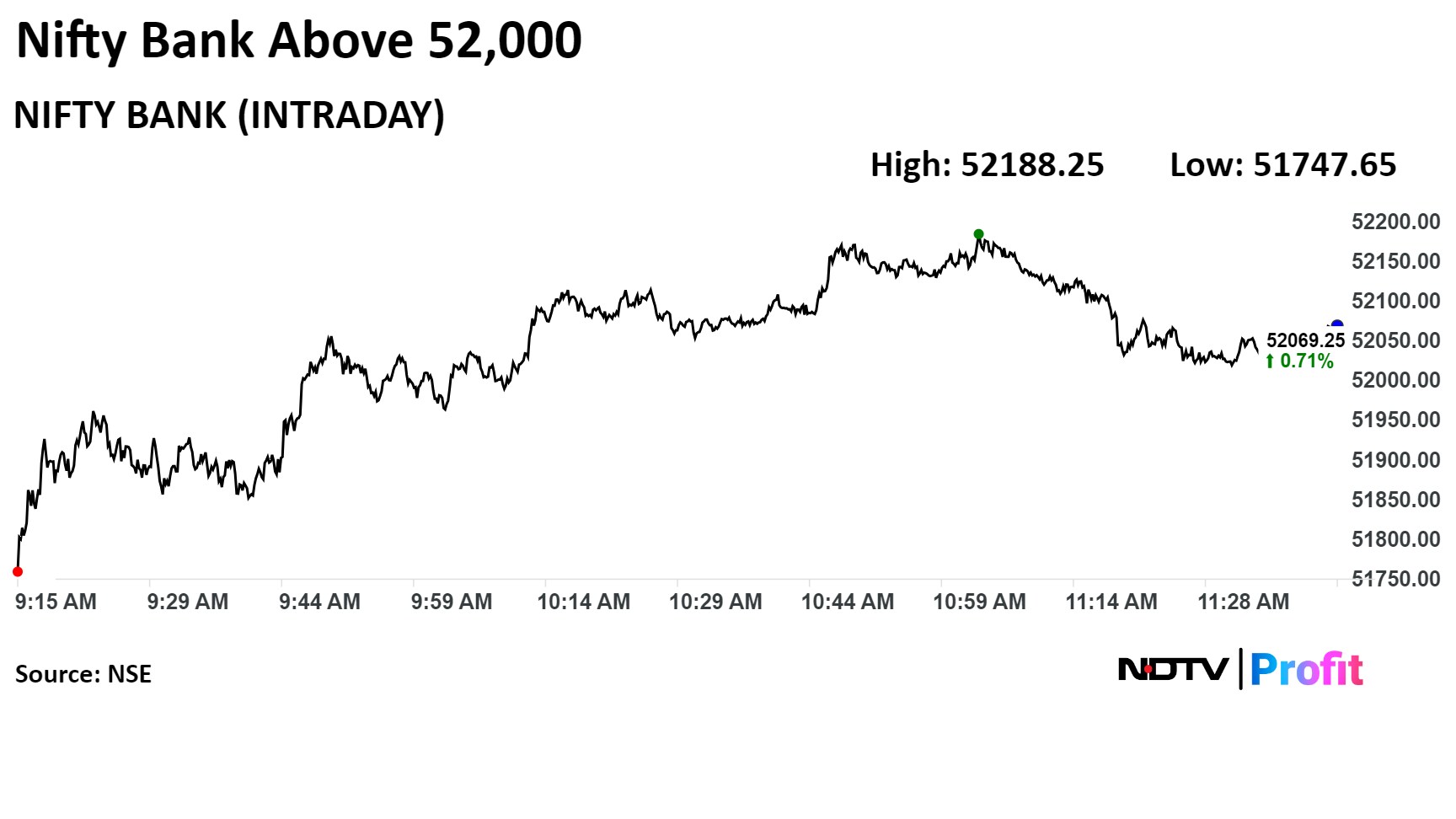 India's benchmark stock indices extended gains, with the Sensex hitting a fresh record high and the Nifty extending gains through midday on Tuesday on buying ahead of the budget amid firm global cues. The Nifty Bank hit a record high earlier in the day, trading above the 52,000 mark.