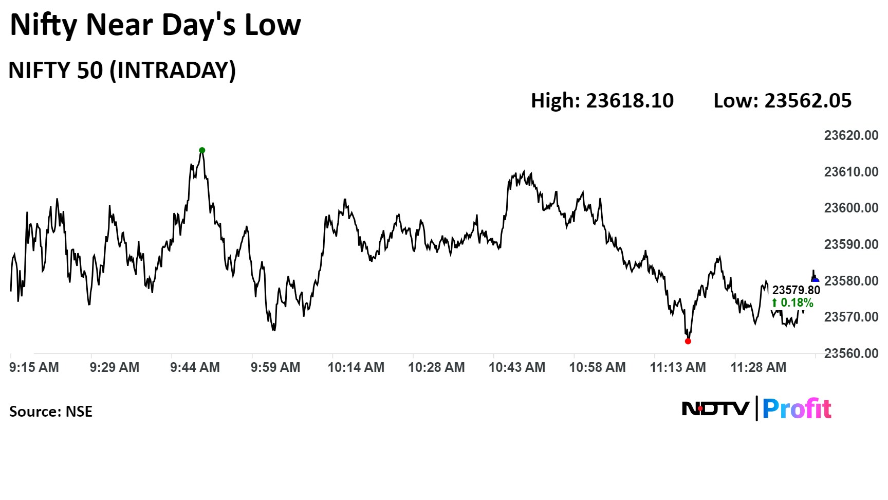 As of 12:47 p.m., the NSE Nifty 50 was trading 116.55 points, or 0.50%, higher at 23,656.35, and the S&P BSE Sensex gained 498.4 points, or 0.64%, to trade at 77,848.25.