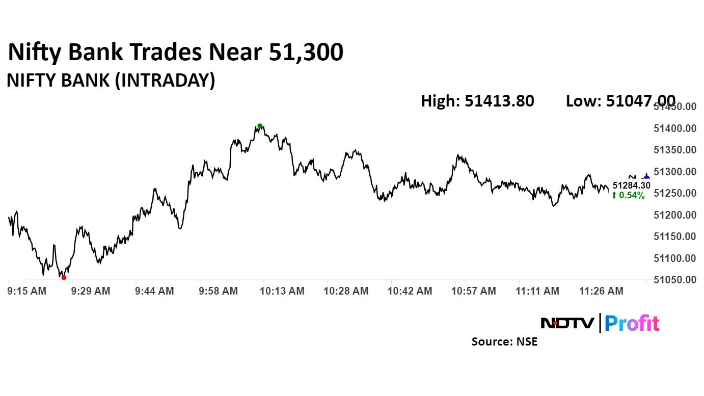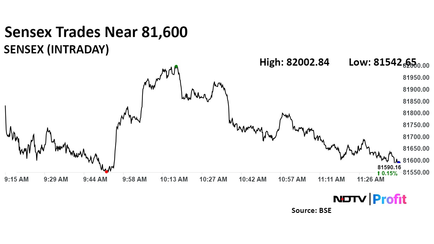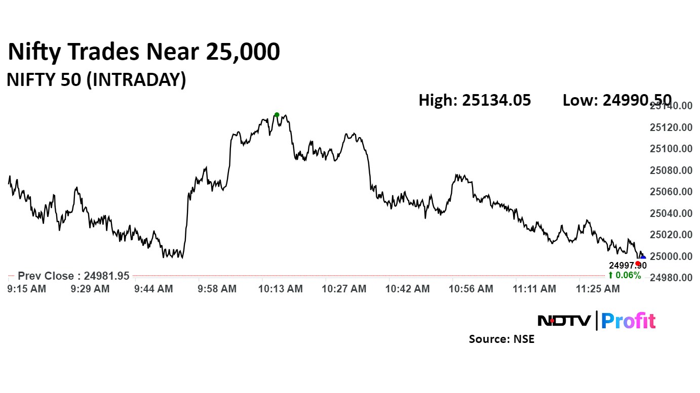 The NSE Nifty 50 and BSE Sensex pared most gains from the morning, tracking declines in Infosys Ltd. and Trent Ltd.'s share prices. As of 11:47 a.m., the Nifty 50 was 0.17%, or 42.50 points higher at 25,024.45, and the Sensex was up 214.98 points, or 0.26% at 81,682.08.