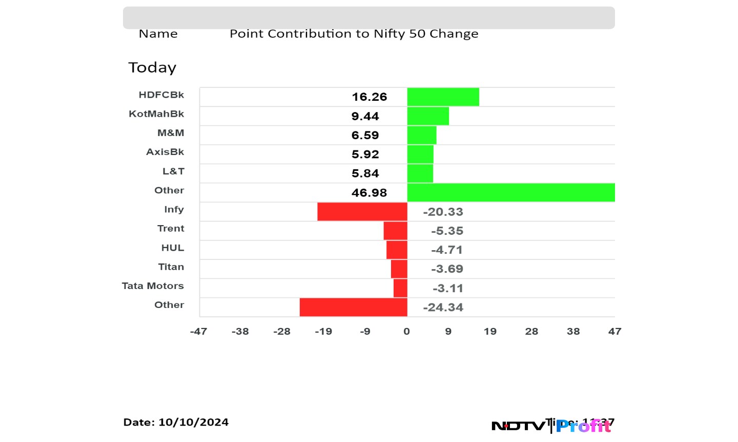 Shares of HDFC Bank Ltd., Kotak Mahindra Bank Ltd., Mahindra & Mahindra Ltd., Axis Bank Ltd. and Larsen & Toubro Ltd. were positively contributing to changes in the Nifty.