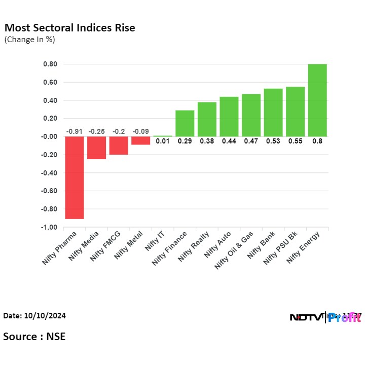 On NSE, six out of 12 sectors advanced, four declined, and one remained flat. The NSE Nifty Energy rose the most, and the NSE Nifty Pharma declined the most.