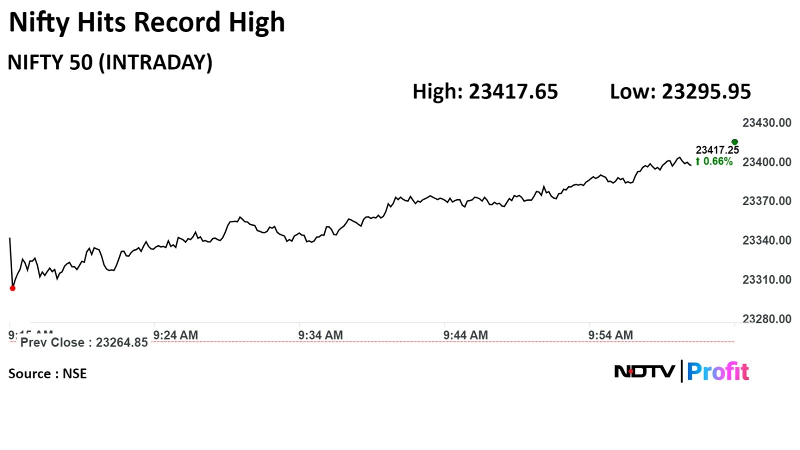 The NSE Nifty 50 rose 0.67% to record high of 23,417.65 tracking gains in shares of heavyweight HDFC Bank Ltd., ICICI Bank Ltd.