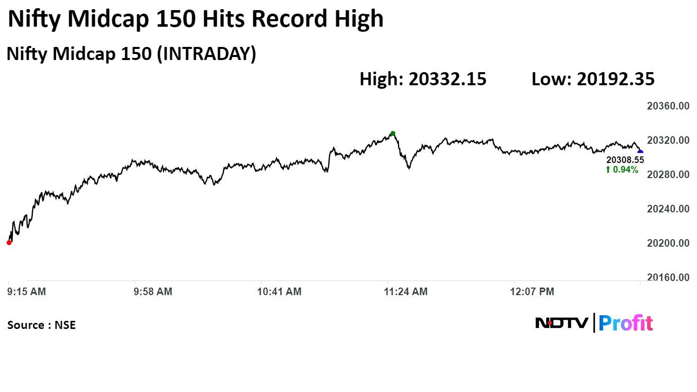 The NSE Nifty Midcap 150 rose 1.06% to 20,332.15, the highest level since its inception on April 1, 2016. It was trading 0.91% higher at 20,300.45 as of 12:53 p.m., as compared to 0.58% advance in the NSE Nifty 50 index.