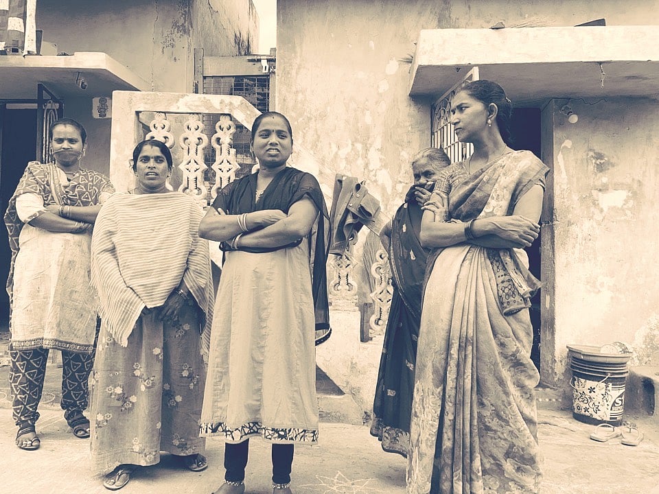 At Ramalinga Colony in Munagapaka, some of the residents are sitting close to the colony's entrance and others start to come out of their homes and gather around.