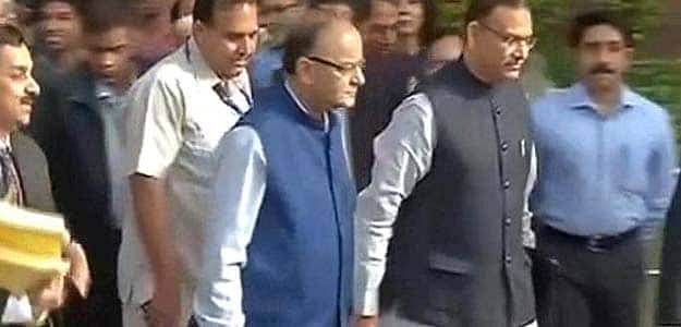 Finance Minister Arun Jaitley, in a bright blue jacket, has reached Parliament House with the famous brown briefcase that holds the Modi government's first full-year Budget; he will present it at 11 a.m. today.