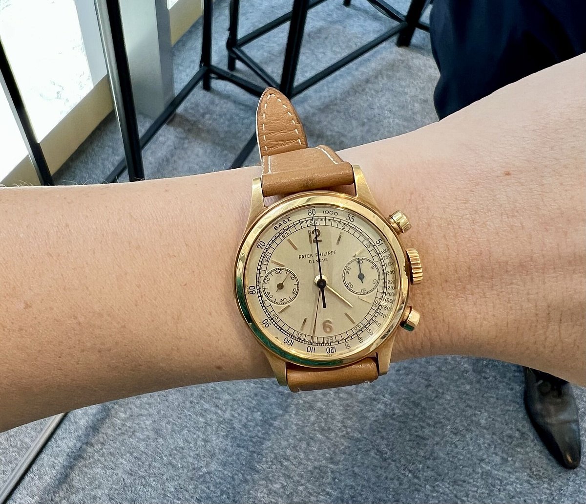 During a preview Tuesday at the auction house’s showroom in the Dubai International Financial Center, I was lucky enough to try on a few: a 1953 Patek Philippe 18K gold chronograph, with an estimate of $200,000 to $300,000; a Rolex Day-Date ref. 1803 gold automatic wristwatch with an Arabic-language calendar, estimated at $20,000 to $40,000; and a Patek Philippe platinum perpetual calendar chronograph once owned by the boxer Mike Tyson, estimated at $240,000 to $440,000.