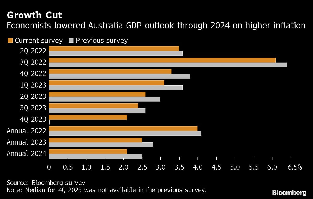 (Bloomberg) -- Australia’s economy will expand at a slower pace than previously anticipated this year and next as rapid interest-rate increases to tackle inflation weigh on consumption, a Bloomberg survey showed.