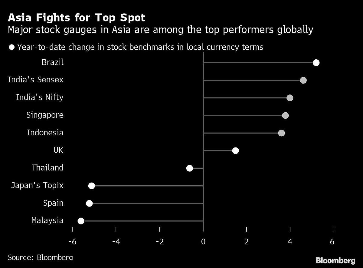 (Bloomberg) -- Three equity markets in Asia are competing to become the biggest gainers in the world this year, even as a stronger dollar hurt the appeal of the region.