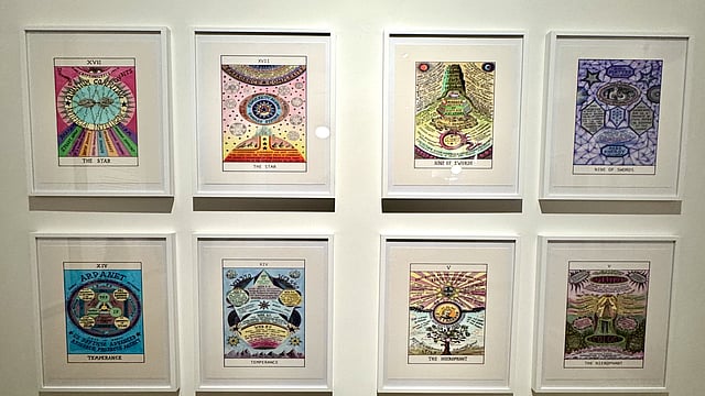 The card is a good omen among the 78 of a full tarot deck because it’s come to mean new beginnings and transformation rather than the grave and decay. On the other hand, Carl says, “the Nine of Swords is terrible.” Harris’ version of that card isn’t on the walls, but there is art from other decks depicting it — with all those threatening blades. They do look bleak, full of anxiety, paranoia and doom dangling above you.
