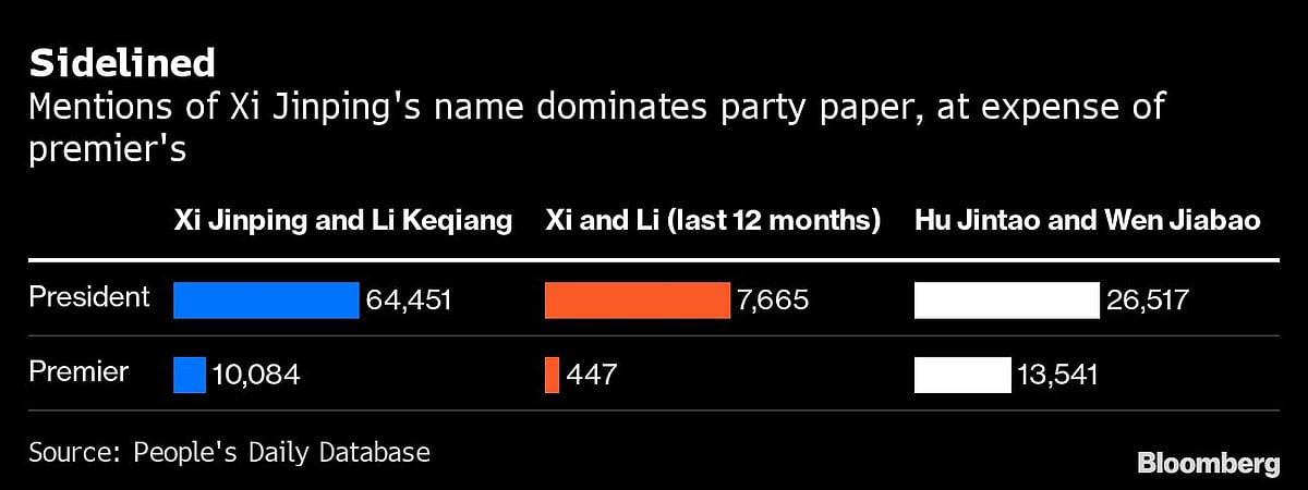 During Xi’s decade in power, the president’s name has been mentioned in the People’s Daily more than six times as frequently as Li Keqiang’s, according to a Bloomberg analysis. That compares with a 2-to-1 ratio during the previous decade when President Hu Jintao and Premier Wen Jiabao were in charge.