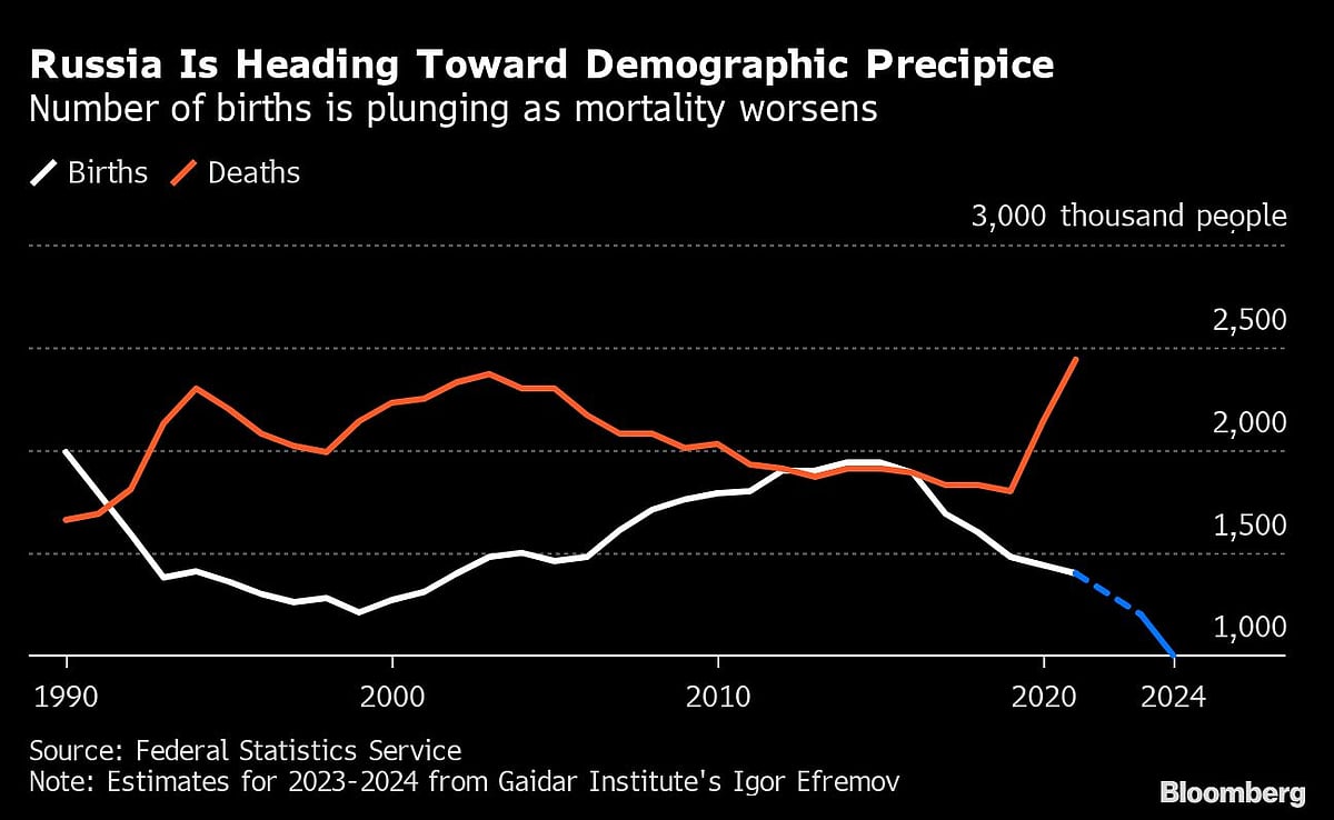(Bloomberg) -- President Vladimir Putin spent years racing against Russia’s demographic clock, only to order an invasion of Ukraine that’s consigning his country’s population to a historic decline.