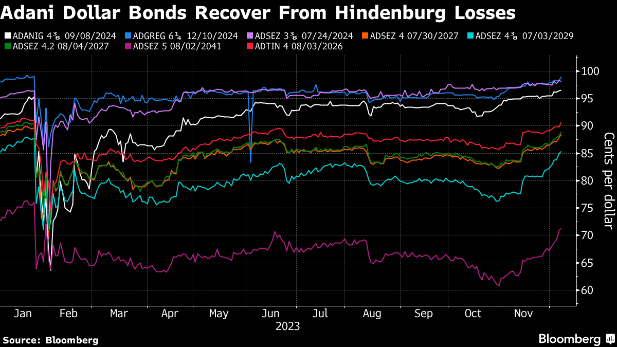 (Bloomberg) -- A rally over the last week was powerful enough to erase some losses on a series of dollar bonds tied to the conglomerate of billionaire Gautam Adani, debt that had dropped after a short seller accused firms owned by Adani of fraud.