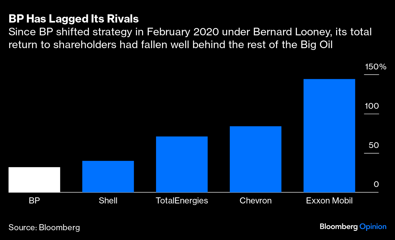(Bloomberg Opinion) -- The British oil major has seen three of its four CEOs depart prematurely over the last two decades: John Browne, Tony Hayward and now Bernard Looney all left early. In the world of Big Oil, where business plans are laid over long periods, that's an anomaly. And BP is lagging its rivals.
