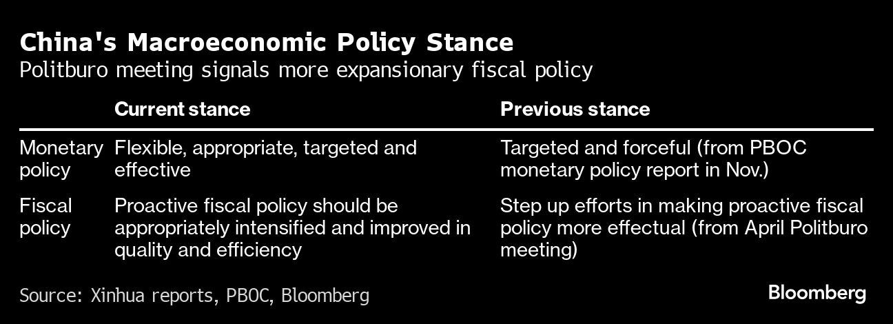 China's Politburo also declared that monetary policy should be flexible, appropriate, targeted and effective, with the previous wording “forceful” dropped from the statement.