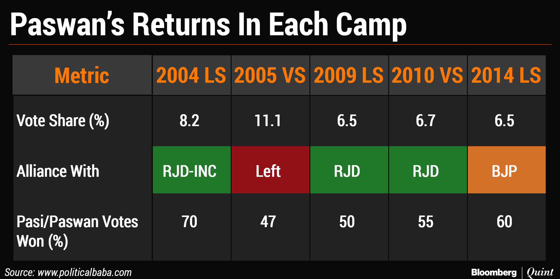 Ram Vilas Paswan, who has a history of being on the right side in most elections, has decided to stay with NDA after some initial bickering. Paswan has been a regular hopper from the UPA to the Left front to RJD and now NDA. He has a strong influence among the 6 percent Dalit voters in the state. In 2014, LJP won 6 out of 7 seats riding on the Modi wave. This time, reports suggest that his son and other family members are facing tough fights due to anti-incumbency.