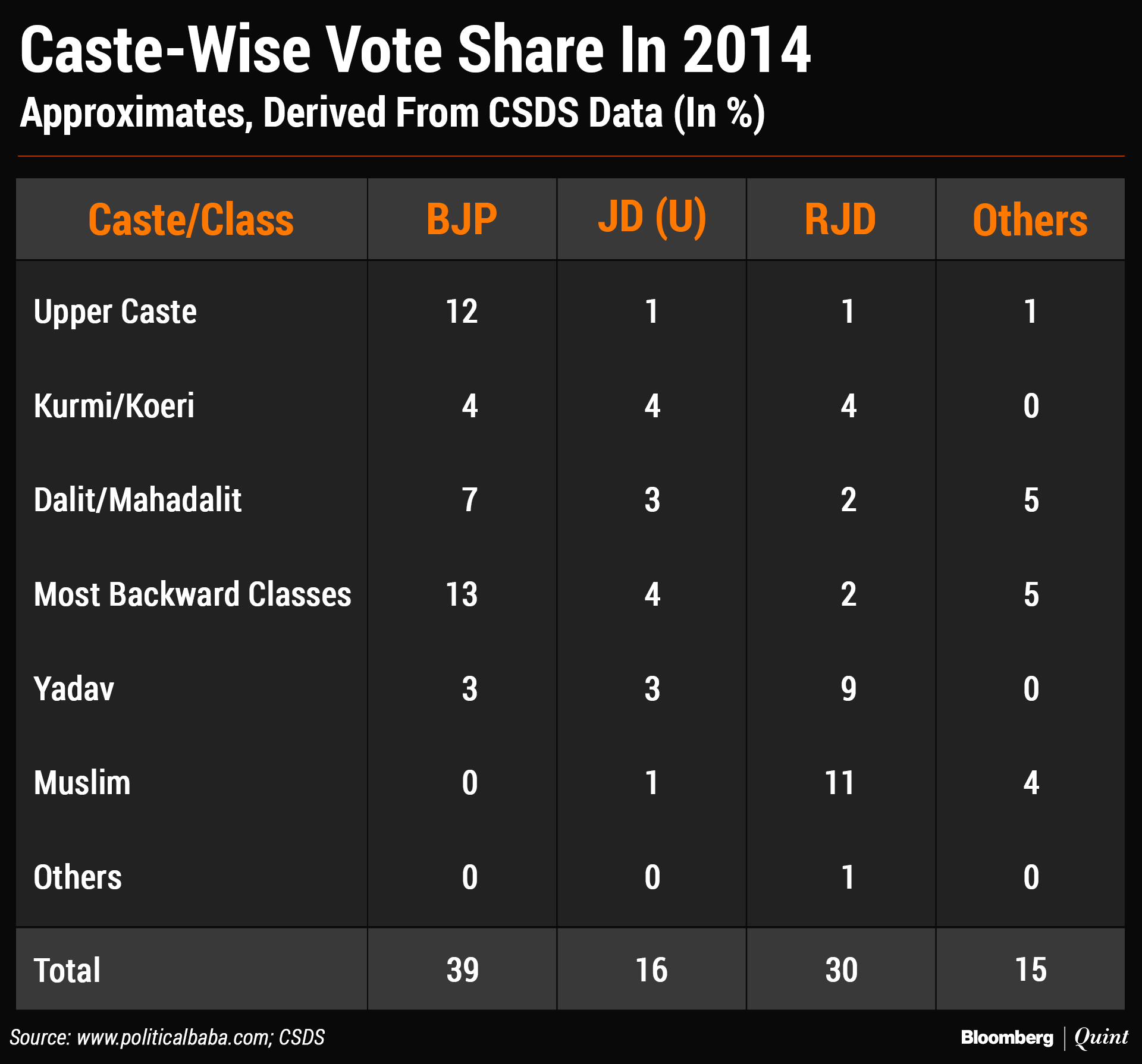 - Around half of JD(U) voters are Kurmi-Koeri, Muslims and upper caste.