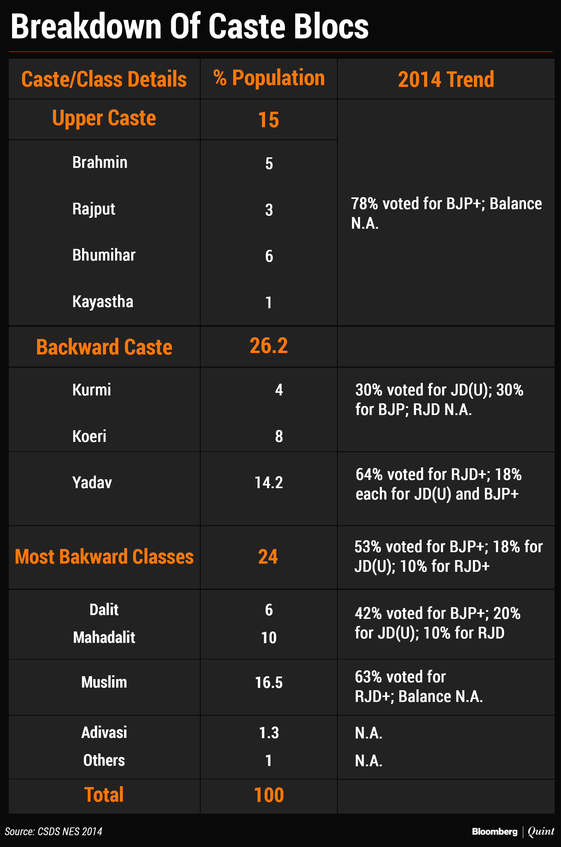 The state is a hotbed of caste politics. Upper caste (15 percent), Yadavs (14 percent), Muslims (17 percent), Dalits and Mahadalits (16 percent) are the key constituents of the population. Traditionally upper caste, Kurmis (the community to which Nitish Kumar belongs) and Dalits have backed the NDA whereas Muslims and Yadavs have supported the UPA/mahagathbandhan.