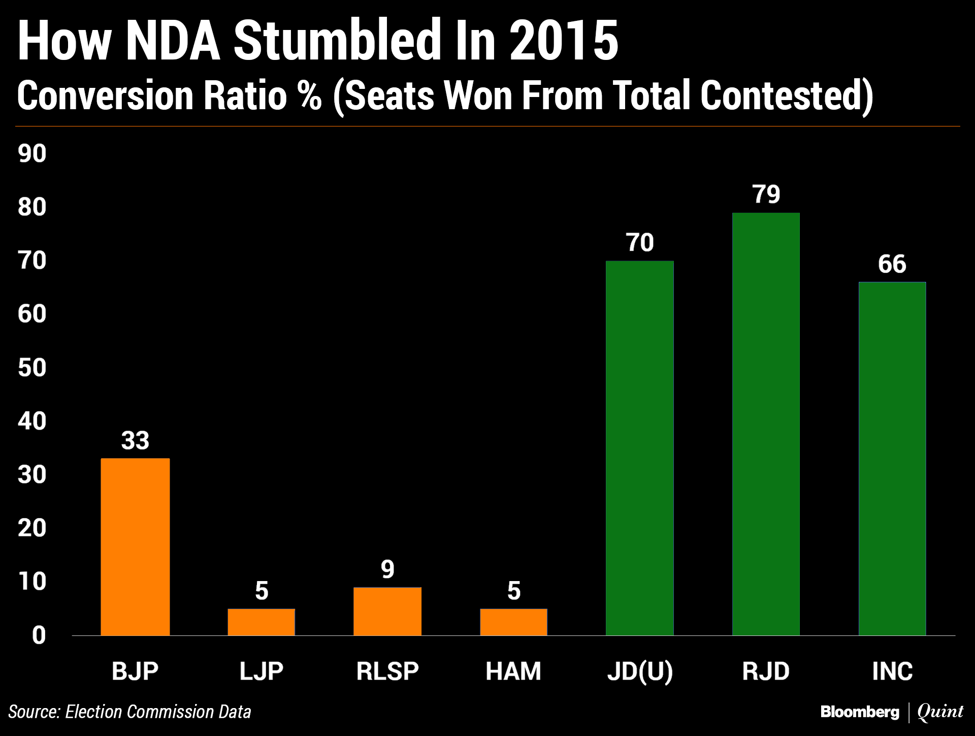 One of the reasons why the NDA lost to the mahagathbhandhan (which Nitish Kumar then led) in the 2015 Vidhan Sabha elections was the poor performance of RLSP, LJP, and HAM. All of them had a strike rate of less than 10 percent.