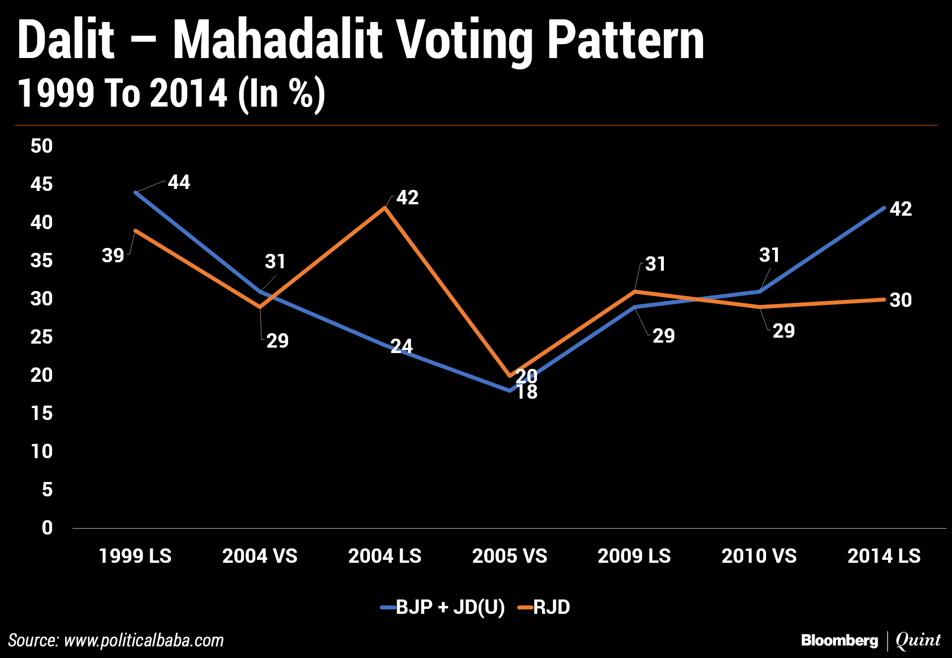 Not a single MLA from the JD(U) left the party along with Sharad Yadav when he floated his own party. The months-old Vikasshil Insan Party has been given three seats. Nitish Kumar created the Mahadalit category and commands good hold over them. 20 percent Mahadalits supported JD(U) when it contested alone in the 2014 Lok Sabha elections. Similarly, Nitish also has good support among over Koeri/Kushwaha voters. 30 percent of Koeris supported JD(U) in 2014.