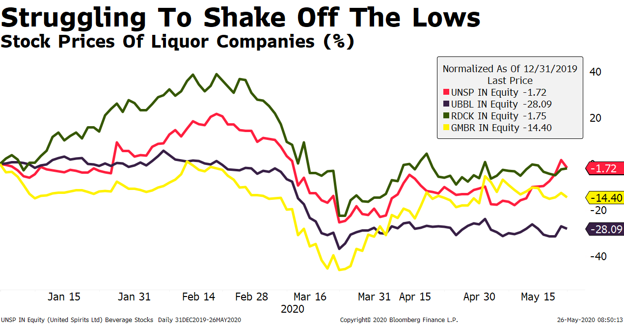 Stocks of Indian distillers have recovered some losses after the worst plunge in more than a decade as investors bet on reopening stores and home delivery of alcohol. Yet, that's not enough as consumption, slowing even before the pandemic, may take longer to recover and revenue-starved states increase taxes on liquor.