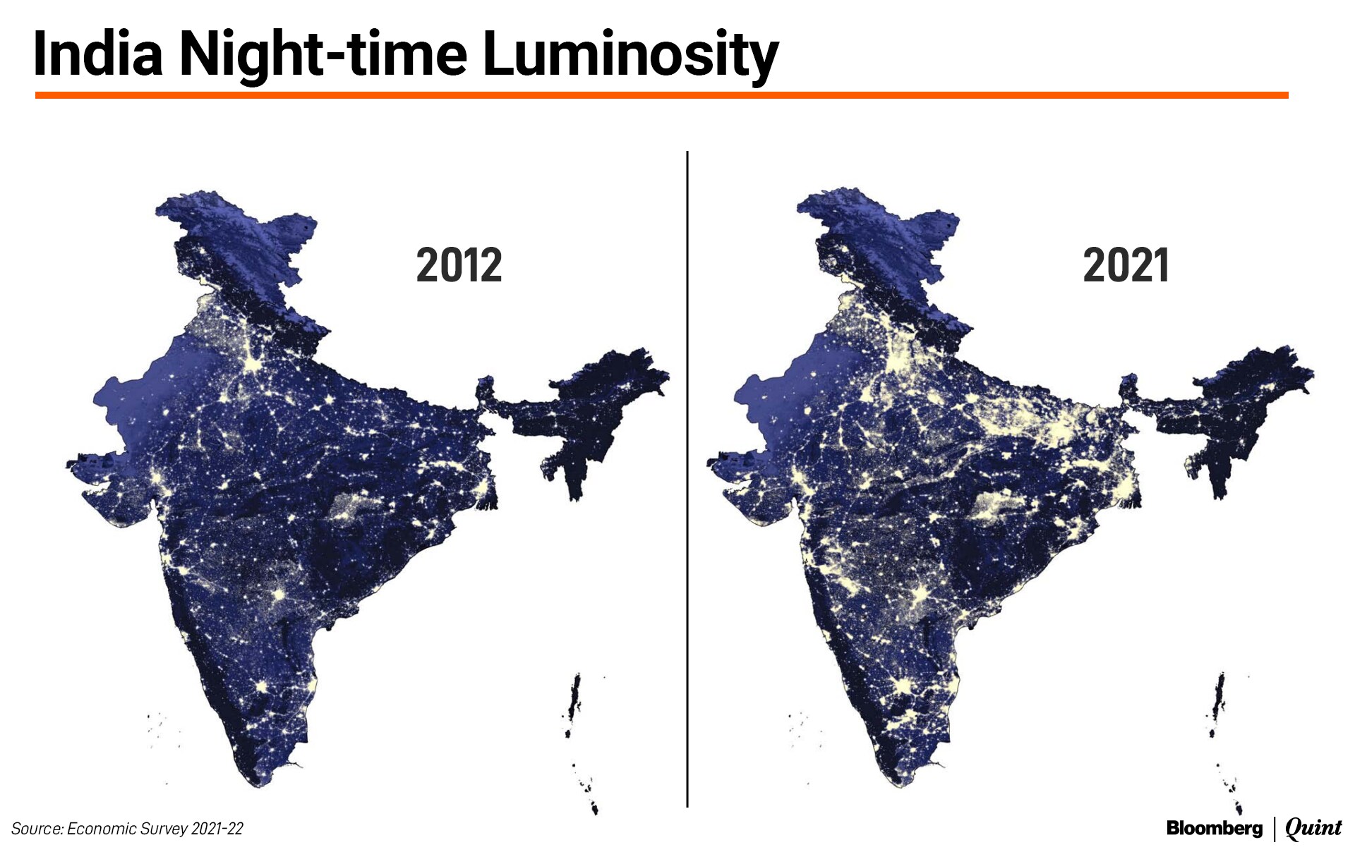 Using satellite images, India's nighttime luminosity is compared between 2012 and 2021.