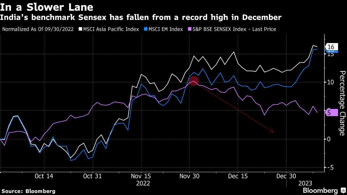 India's benchmark S&P BSE Sensex Index has fallen 5% as of yesterday's close from an all-time high in December, with foreign funds net selling $595 million of local equities this month to Jan. 9. The nation's stocks outperformed most major markets during the last two years as individual investors piled in during the pandemic.