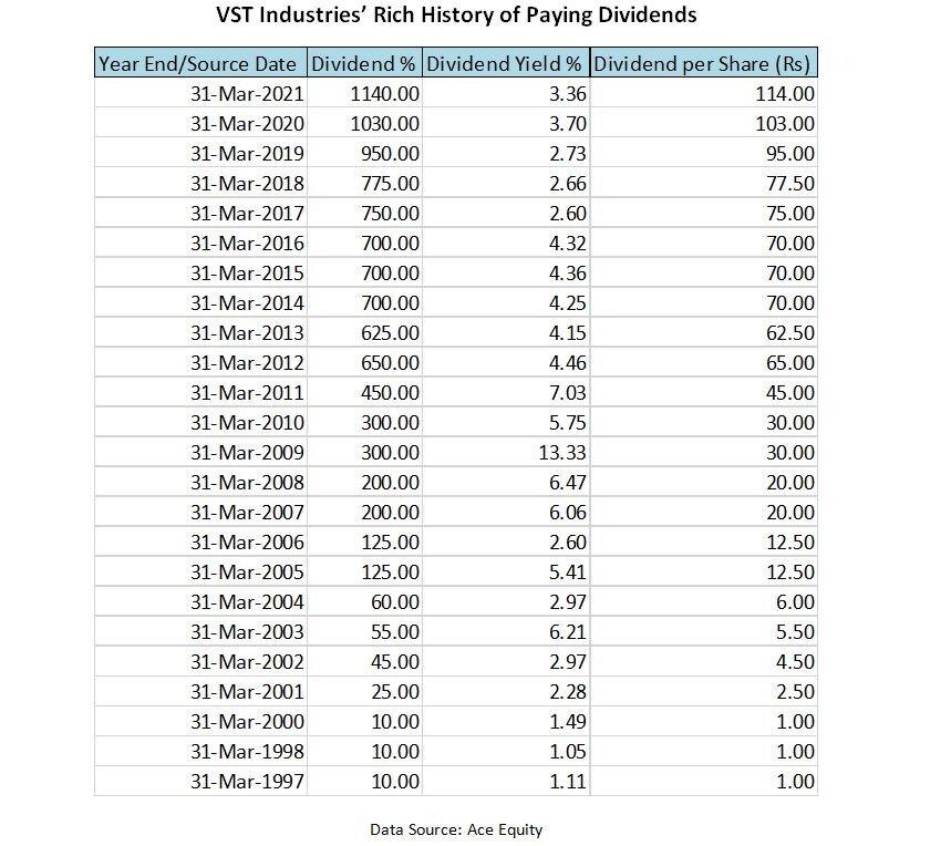 Speaking of dividends, VST Industries has a rich and long history, having paid consistent and increasing dividends since 1997.