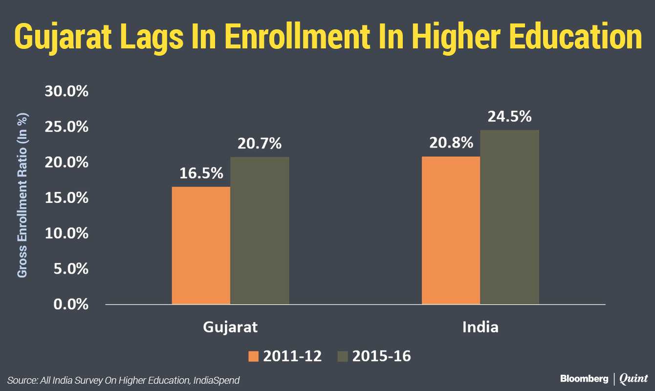 Enrollment in higher education (age 18-23) in Gujarat has also been lower than the India average.