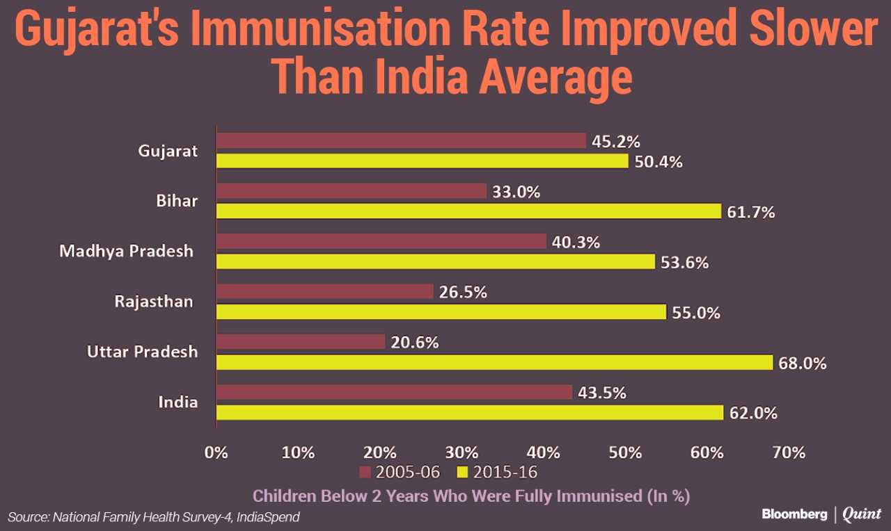 In 2015-16, 50.4% of children below two years in Gujarat were fully immunised, lower than some of India's poorer BIMARU (Bihar, Madhya Pradesh, Rajasthan and Uttar Pradesh) states, IndiaSpend reported in April 2017.