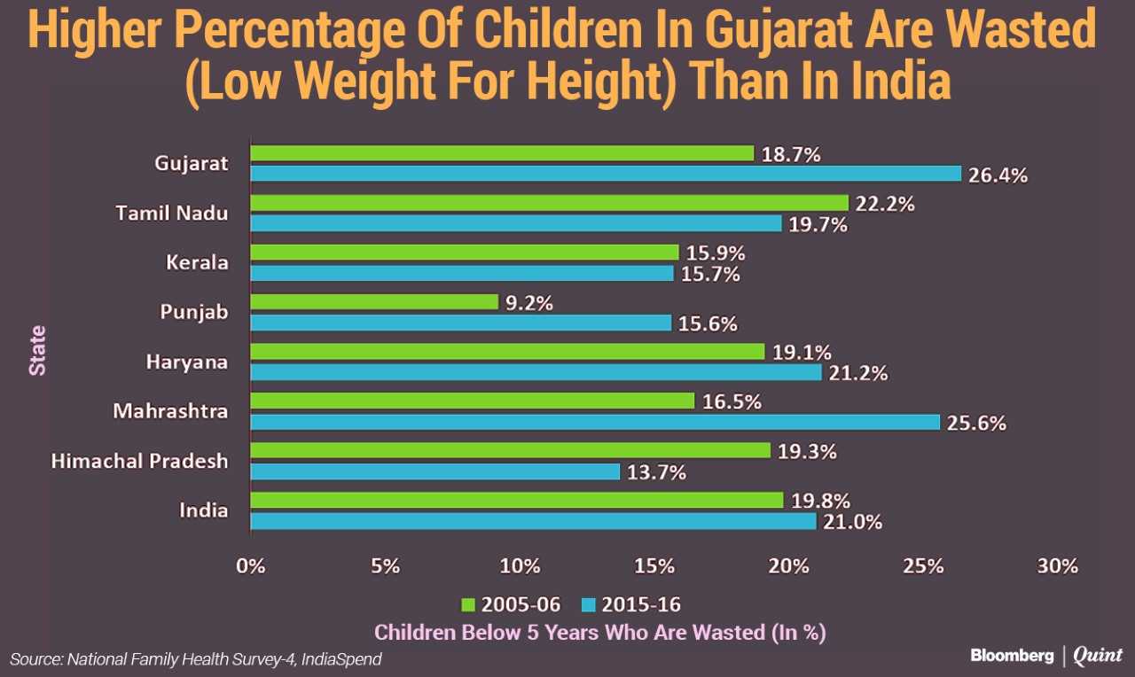 Wasting results from inadequate nutrition. In 2015-16, 5.2 percent of children below two years received an adequate diet in Gujarat, compared to 9.6 percent in India, according to NFHS data.