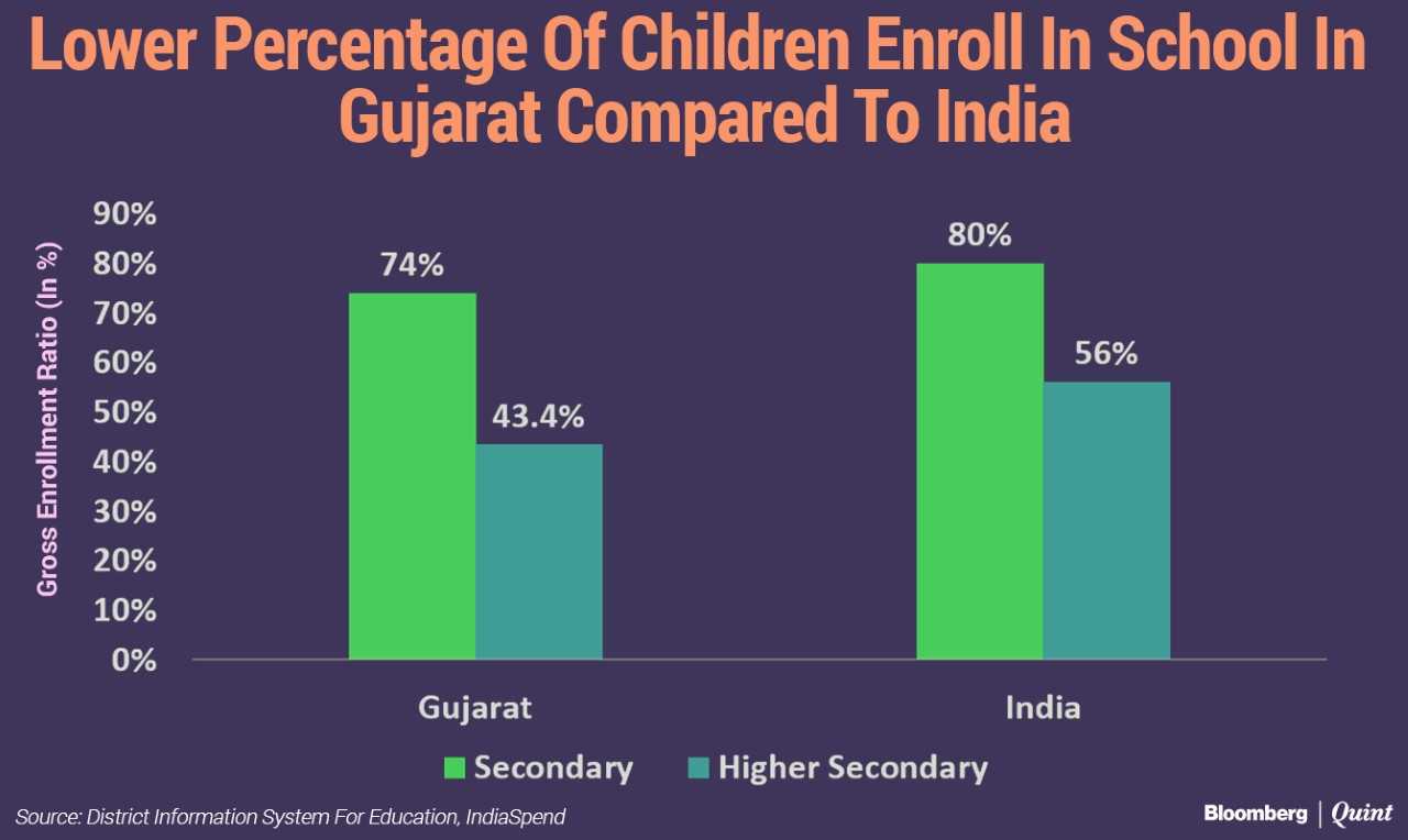As many as 95 percent of all children in Gujarat enroll in primary school (grades I-V), but only 74 percent of secondary school-age (grades IX-X) children enroll in school, six percentage points lower than the Indian average of 80 percent, according to data from District Information System For Education (DISE).